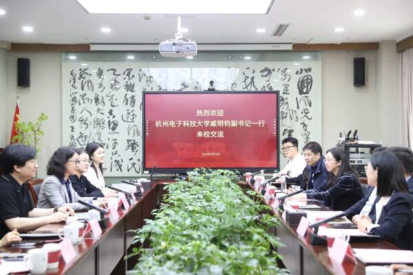 2024年4月19日,杭州电子科技大学党委副书记戚明钧一行来我校开展调研交流工作。中国美术学院党委副书记傅巧玲、中国美术学院研究生处(研工部)相关负责人等参加调研座谈会。