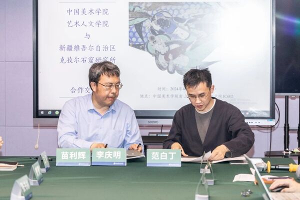 范白丁、苗利辉分别代表艺术人文学院和克孜尔石窟研究所签订战略合作协议。