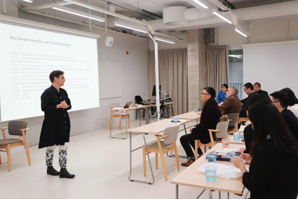 阿尔托大学设计学院研究院长Turkka Keinonen教授,设计系主任Tuuli Mattelmaki教授,Andrés Lucero教授,外事交流处副处长Hanna Karkku女士和阿尔托大学高级访问学者陈朝杰教授接待了由中国美术学院工业设计学院、时尚设计学院、文创设计智造业协同创新中心组成的设计学科团队。