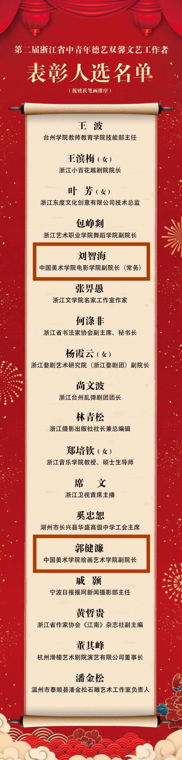 2月1日,第二届浙江省中青年德艺双馨文艺工作者表彰会在省文化会堂(浙江展览馆)举办,全省共有18名艺术家被授予“浙江省德艺双馨中青年文艺工作者”荣誉称号,中国美术学院电影学院副院长(常务)刘智海、绘画艺术学院副院长郭健濂获此殊荣。