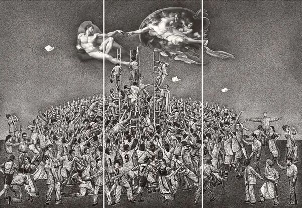 大奖获得者张敏杰的平版作品《舞台系列No.10》在材料技术上沿用18世纪德国阿依斯·塞内菲尔德发明的平版技法,以铅笔复合技术手绘施以薄、厚叠加的多层次印刷,使色阶间的对比增强,尽显厚重与丰富。渐变的色调集聚现代都市人们于非常规物象之中显现出的韵味和美感,体现了当代独具个性的印痕美。作品以特殊的审美情绪将艺术家对宇宙间生命的关注,转入深层次的人性挖掘上,将东西方文化融汇于作品,溢散出对宇宙生命的真切体验。艺术家以象征的手法演绎出对社会、生命的关注,进而牵动着作品观赏者敏感的神经。作品多以隐喻、象征的理性追求,显得厚重、崇高、肃穆而震撼人心,以一种新的视觉图式和内在张力呈现出独特的审美感受。