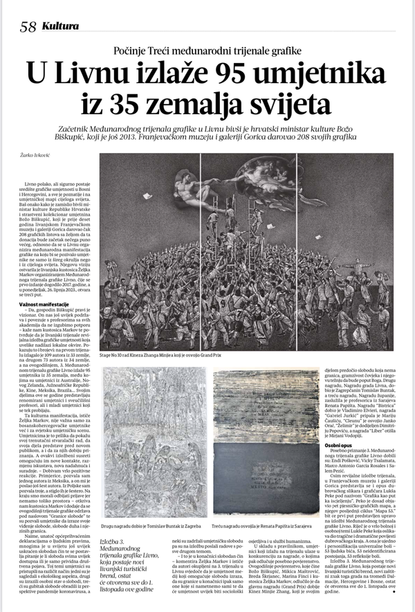 波黑利夫诺国际版画展,每三年举办一次。来自中国、加拿大、波兰、意大利、俄罗斯、英国、法国、奥地利、巴西、芬兰、荷兰、挪威、希腊、克罗地亚、保加利亚、智利、斯洛伐克、捷克、墨西哥、葡萄牙、土耳其、澳大利亚、日本等34个国家的900余件版画作品齐聚利夫诺。展览为期三个半月,自2023年6月19日至10月1日。