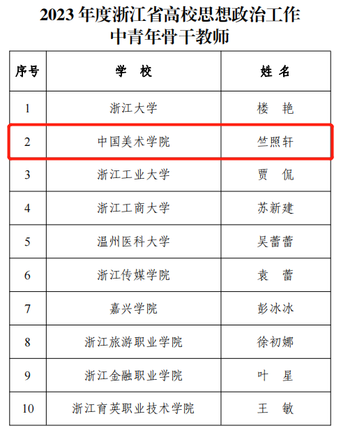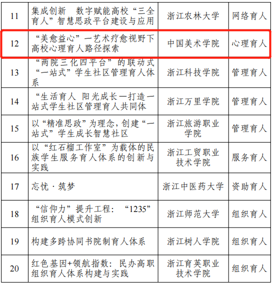 高校思想政治工作质量提升综合改革与精品建设项目包括高校思想政治工作精品、高校思想政治工作中青年骨干、高校网络教育名师、高校原创文化精品、高校思想政治工作研究文库5个类别。我校学工部部长竺照轩入选2023 年度浙江省高校思想政治工作中青年骨干教师,我校报送的《“美愈益心”一艺术疗愈视野下 高校心理育人路径探索》入选2023 年度浙江省高校思想政治工作精品项目。