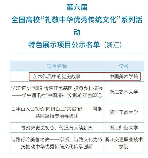 近日,教育部思想政治工作司公示了第六届全国高校“礼敬中华优秀传统文化”系列活动遴选结果。中国美术学院艺术人文学院“艺术作品中的党史故事”获评特色展示项目。