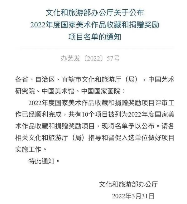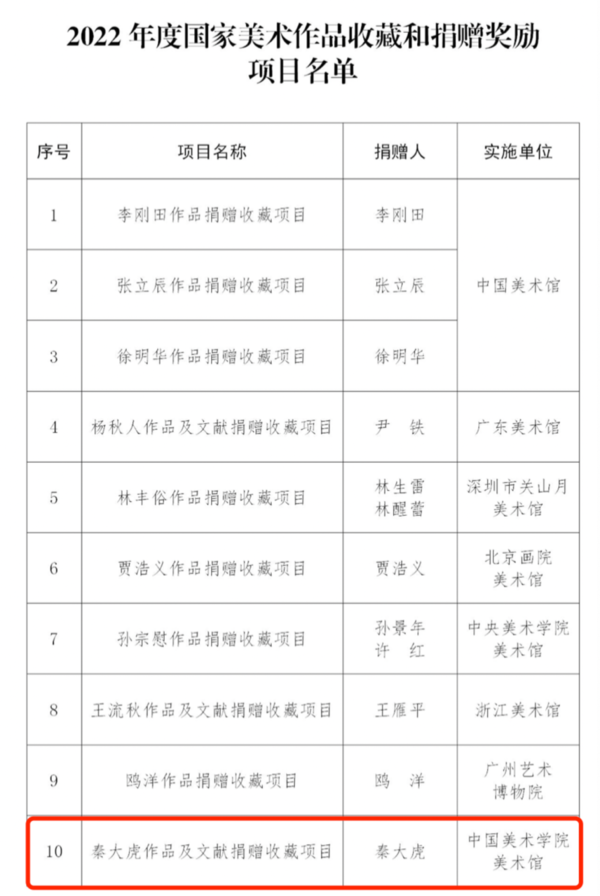 根据《文化和旅游部办公厅关于公布2022年度国家美术作品收藏和捐赠奖励项目名单的通知》(办艺发〔2022〕57号)安排和遴选工作方案,经评审和公示,共有10个项目被列为2022年度国家美术作品收藏和捐赠奖励项目。中国美术学院美术馆秦大虎作品及文献捐赠收藏项目(捐赠人:秦大虎)入选 2022年度国家美术作品收藏和捐赠奖励项目。