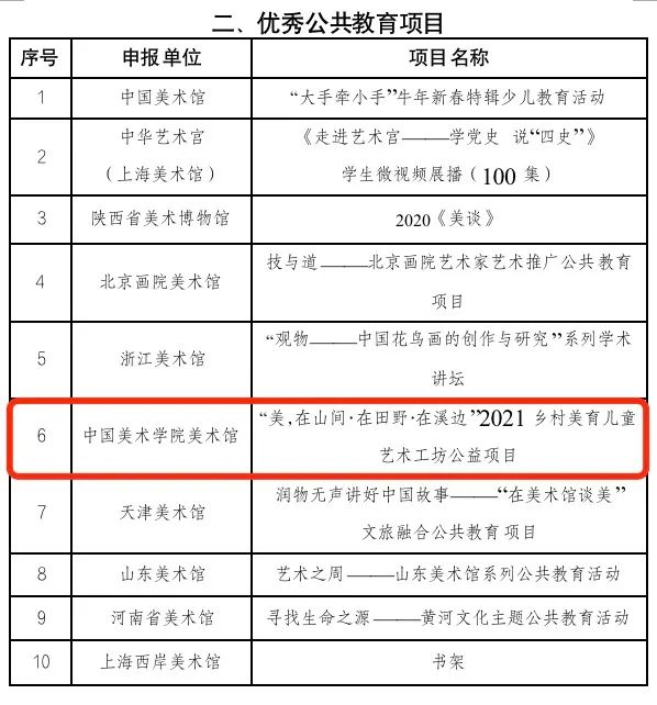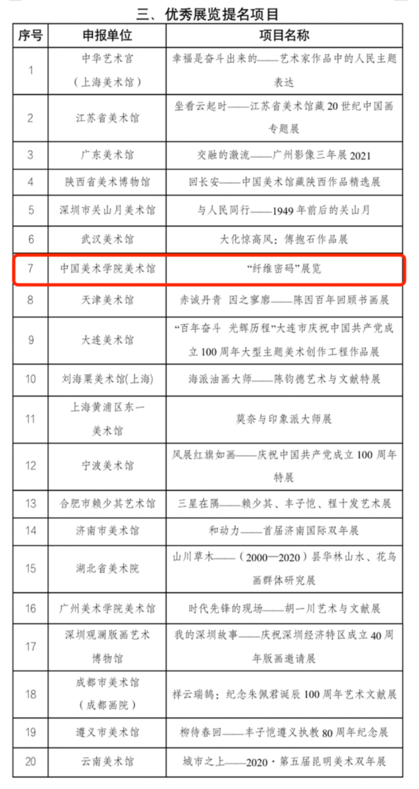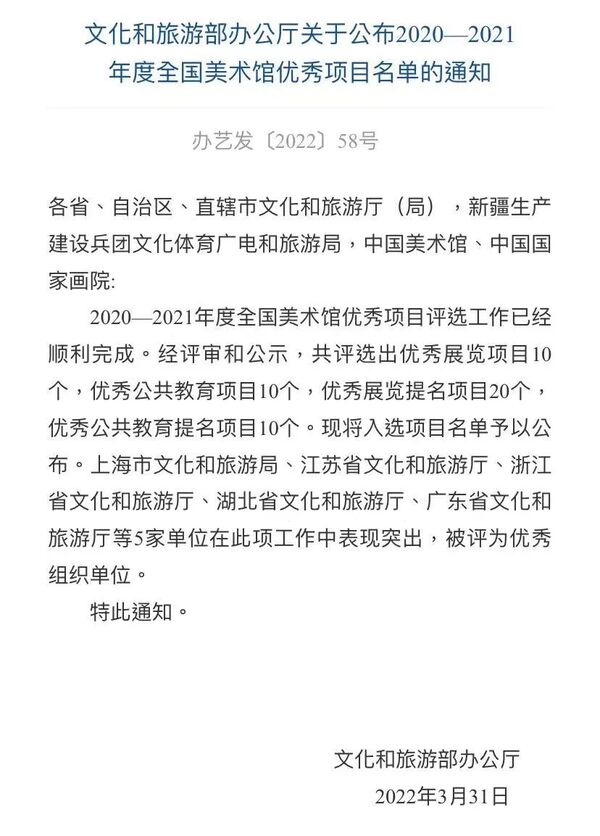 根据《文化和旅游部办公厅关于公布2020—2021年度全国美术馆优秀项目名单的通知》(办艺发〔2022〕58号),经评审和公示,共评选出优秀展览项目10个,优秀公共教育项目10个,优秀展览提名项目20个,优秀公共教育提名项目10个。