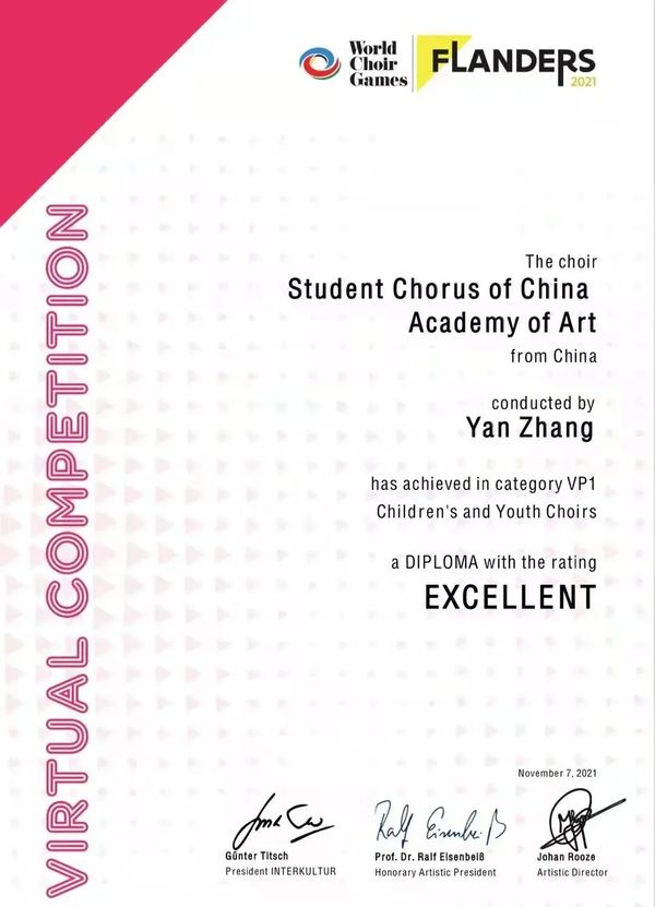 在2021年11月7日落下帷幕的第十一届世界合唱比赛中,中国美术学院大学生合唱团从全球300余支优秀合唱团体中脱颖而出荣获最高级别Excellent奖!
