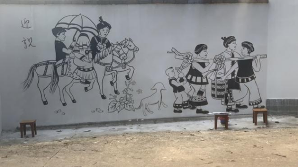 此次墙画修补与创作的主题为“山冲村传统风俗”,包括“彝族娶亲”、“秋景”、“农忙”等乡村场景,展现山冲村村民勤劳、质朴的形象。