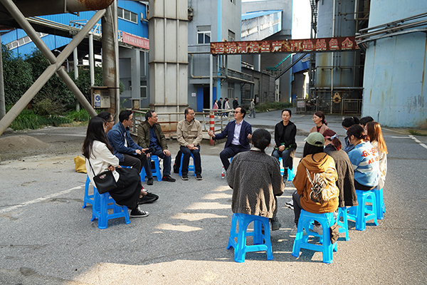金秋十月,“不似春光”,“胜似春光”。在富阳清园生态热电厂,雕塑与公共艺术学院的师生正热火朝天进行调研。师生们跟着厂区工作人员的介绍,边交流边调研,并举行了座谈会。在百米高的烟囱旁,在蜿蜒曲折的建筑边,大家围坐一圈,畅所欲言。