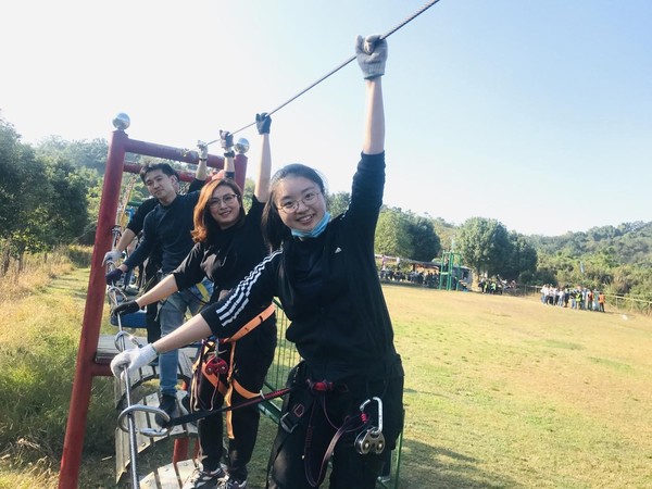 挑战难度最大的项目是“丛林探险”。青年老师们分成若干小组,挖掘自身潜能,互相鼓励,团结协作,通过爬、滑、游、跨、跳、飞等高难度动作穿越立柱间难易不同、风格迴异的障碍关卡,最后从高空自由滑翔而下,到达终点。一声声喝彩划破天际,将拓展训练的气氛推向高潮。大家坚定信心,充分发扬了努力拼搏的精神,进一步增强了青年教师队伍的凝聚力和战斗力。