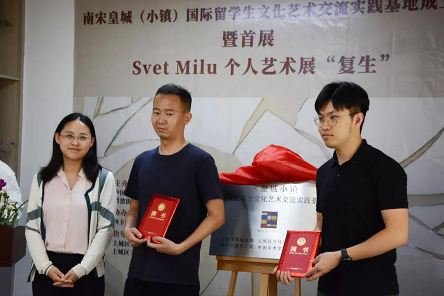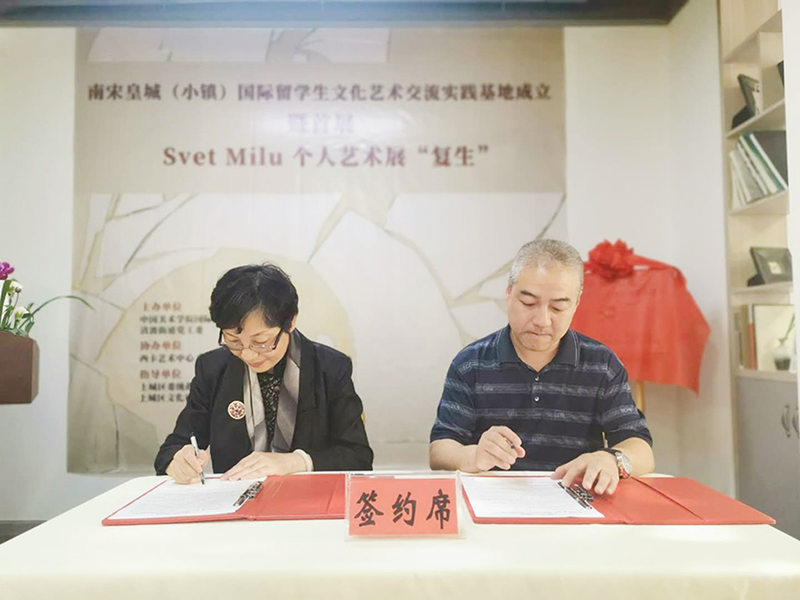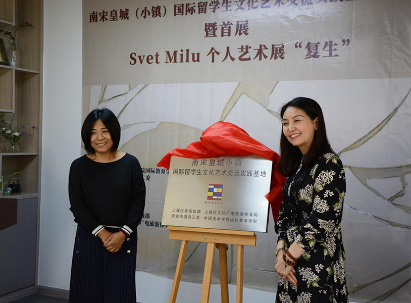上城区旅游文化体育局书记赵楠与西卡艺术中心总经理刘喜君共同为南宋皇城小镇国际留学生文化艺术交流实践基地揭牌