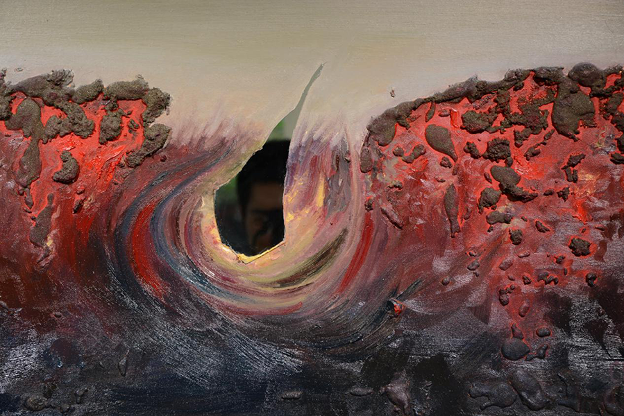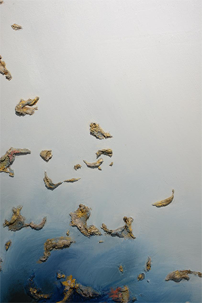 “复生”是对一种新的绘画语言的探索,它将深入到我们的物质和精神存在的联系之中。因此,我的画想表达的是寻找、反思的需要,与我们真实的自己联合起来,通过对物质和精神的原始匹配点的视觉解构,为个体的自我感知和自我重建奠定了基础。
