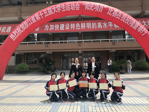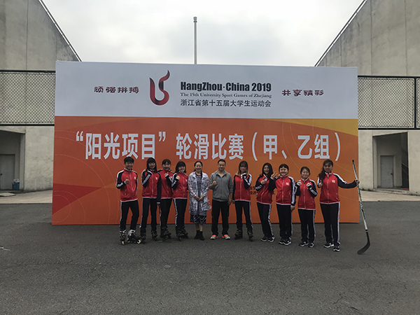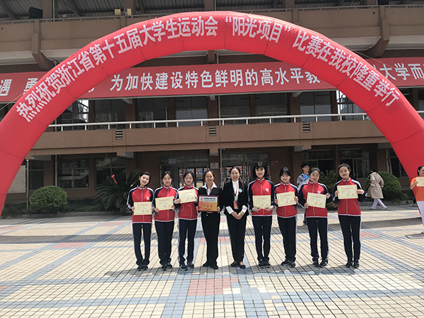 4月26-27日,浙江省第十五届大学生运动会“阳光项目”竞赛在下沙高教园区各高校圆满结束。来自全省不同高校的2948名运动员组成的79支代表队参加,我校阳光运动队51名运动员,在体育部书记张杰的组织带领下,参加了轮滑、拔河、跳绳、趣味拓展、第九套广播体操等5个大项8个小项的比赛。经过紧张激烈的拼搏,最终获得一等奖2项,二等奖1项,三等奖4项的佳绩。