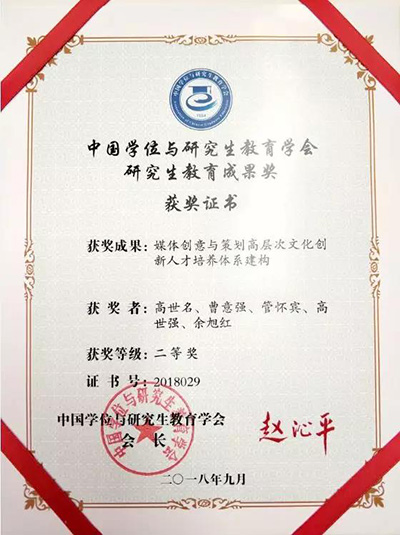 近日,第三届中国学位与研究生教育学会研究生教育成果奖评选结果公布,我校中国艺术教育研究院、跨媒体艺术学院研究生导师高世名,曹意强,管怀宾,高世强,余旭红团队完成的“媒体创意与策划高层次文化创新人才培养体系建构”教育实践成果荣获“第三届中国学位与研究生教育学会研究生教育成果奖”二等奖。