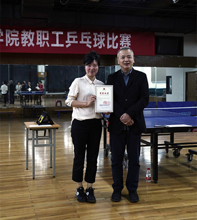比赛结束,校党委书记钱晓芳,党委副书记、工会主席刘正为获奖队员颁发证书和奖杯。 为期二天的比赛,不仅为广大乒乓球爱好者提供了切磋球技的机会,也增进了教职工之间的沟通和交流,丰富了教职工文体活动,推动了教职工健身活动的开展。