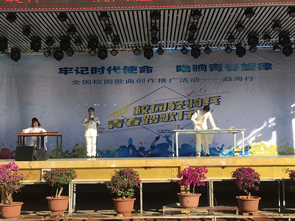 “校园轻骑兵青春踏歌行”文艺小分队演职人员由清一色在校大学生组成,同学们的表演节目内容丰富,形式多样,从青春洋溢的原创校园歌曲,到技艺精湛的器乐、书法、戏曲等表演,让边疆的孩子们大饱眼福。我院的轻骑兵小分队成员分别是来自中国画与书法艺术学院研究生陈惊雷、设计艺术学院王昊方和建筑艺术学院的谢剑波,他们精心准备了配乐书法表演。