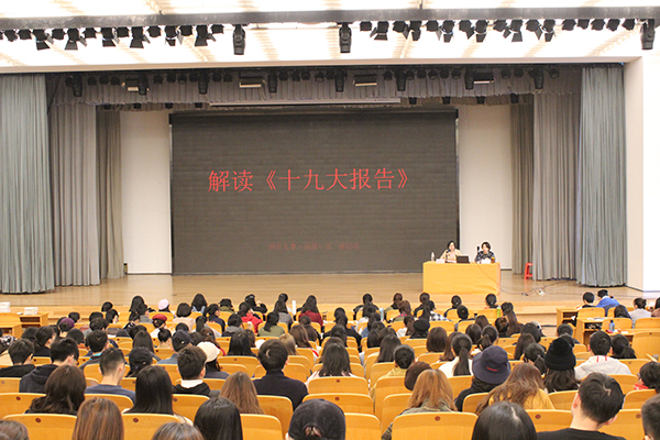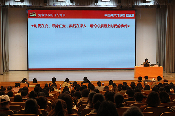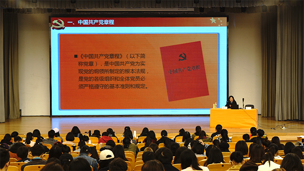 组织人事(统战)部副部长盛晨霞、思想政治社会科学教学部教师范慧为入党积极分子分别作了题为《解读十九大报告》与《解读新< 党章>》的专题辅导报告。两位主讲人就倍受关注的十九大报告和新修订的中国共产党章程,运用视频实例,理论联系实际,深入浅出地进行充分解读。