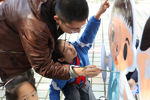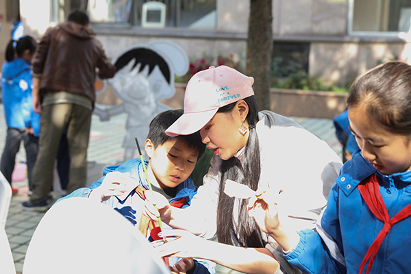 早在今年六月初就与美院附小501班的同学相识的志愿者们,已经是大家的老朋友了。通过与志愿者的互动协助,原本只有素净轮廓的一对对新疆与杭州孩子手牵手的小立人,很快便在六组同学们笔下被染上斑斓明朗的色彩。远在祖国彼端儿童村孩子们的心意仿佛通过笔尖上各色的颜料,交织在了彼此执手的小人儿上,鲜活的落在了中国美院附小的中庭里。