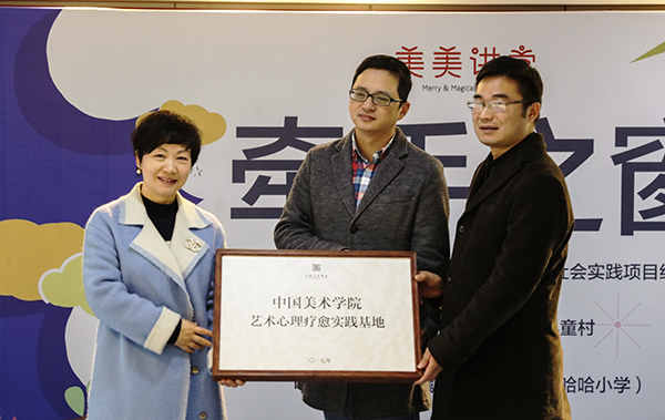 竺照轩、文涛老师为胡君校长授牌“中国美术学院艺术心理疗愈实践基地”