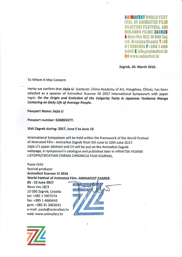 2017年6月,我院动画系青年教师李佳佳的论文入选2017萨格勒布动画电影Animafest scanner现代动画学术研讨会,并获邀在会上发言。此次李佳佳老师获邀发言,代表我院动画理论研究开始展现于国际重要学术研讨会,获得国际学术圈的认可。