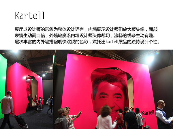 随后卢涛老师分享了他认为会展中最经典且非常优秀的案例——商业化米兰家具展、创新的米兰设计周、艺术的米兰艺术展。以Kartell展厅为例,展厅以设计师形象为整体设计语言,内墙展示设计师们放大版头像,面部表情生动自信,外墙轮廓沿内墙设计师头像裁切,流畅的线条生动有趣,层次丰富内外墙搭配明快的色彩烘托出kartell展品独特的设计个性。还有以布喷绘影像结合表现轻薄质感的Daelli展览。十年前展览不准拍照,而卢老师使用双卡的趣事,利用媒体宣传趋势而促使规定的转变,希望参展者分享从而达到宣传的手段。