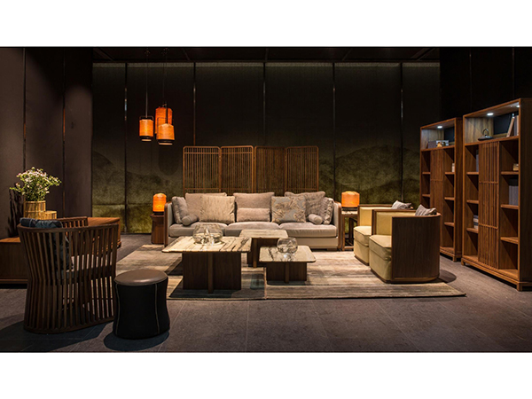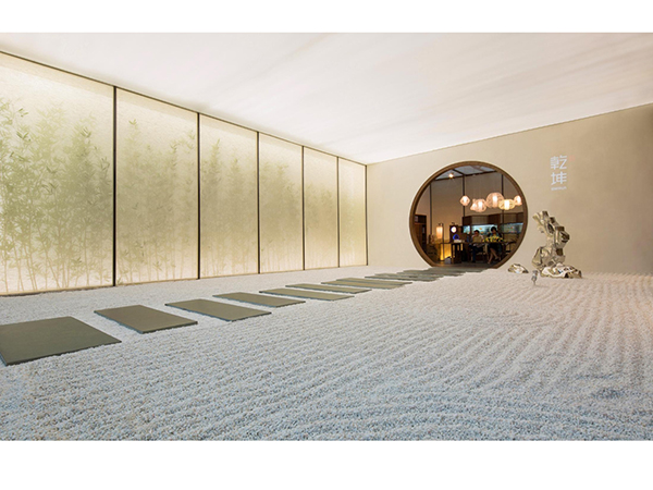 讲座中卢涛老师重点分析了自己做的案例:“乾坤”——当代新中式家具2015、2016年度深圳展上的展示设计。他大胆提出500平方米六米高的空间只展出三套家具的尝试,整体空间采用苏州园林的意境,调动竹林纱幕、枯山水汀步、月亮门、四水归堂等传统创意手法,布水墨绘远山近水,构四季观人生冷暖;营造中和雅正的中国人生活方式。