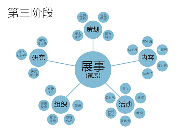 他以图表的形式概述分析:“展示”中,即展位设计分为资料、创意、文件、实施、综合、场景。卢涛老师分别从每一个点中再细节分析了其对展示工作的影响与作用。“展视”展会设计中,分为四个主要的点:主题、外宣、导视和视觉形象。“展事”策展。从策划、内容、活动、组织、研究五大点进行出发,分析了现在策展中的五个基本模块。