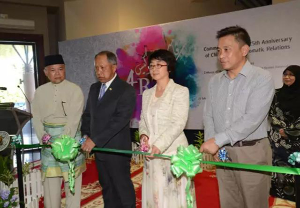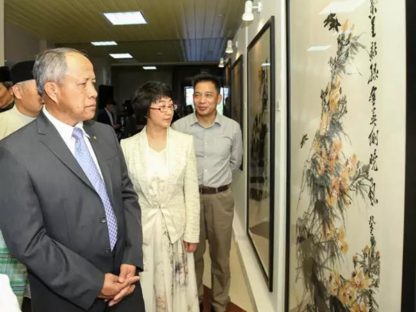中华人民共和国驻文莱达鲁萨兰国大使馆大使杨健致辞并同文莱文化、青年与体育部长哈尔比及两国艺术家代表为画展剪彩。中国美术学院中国画与书法艺术学院中国系教师顾迎庆、刘海勇、陈磊及文方政府官员、驻文使节、华社代表等当地友好人士近100人出席开幕式。