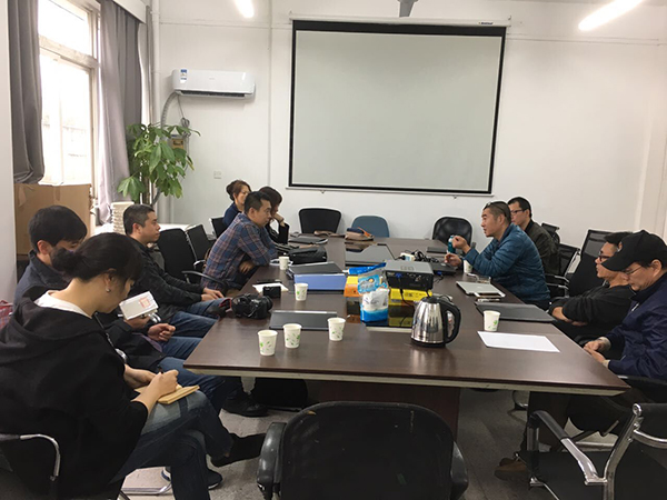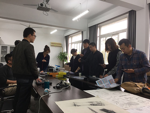 李沐老师为来访同行讲述了我院设计基础教学的教学理念、教学模块,通过PPT介绍了一学年设计分部教学的课程环节、教学方法,设计基础教学面临问题以及应对思考。周晓帆老师与叶维亮老师参与了介绍与说明,并分别用实例展开介绍了几项设计核心课程与2016年度具体的教学案例。