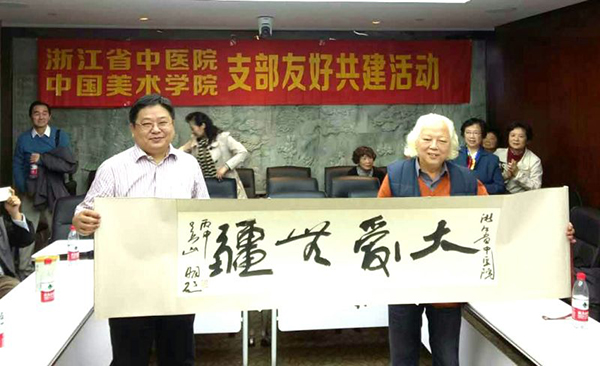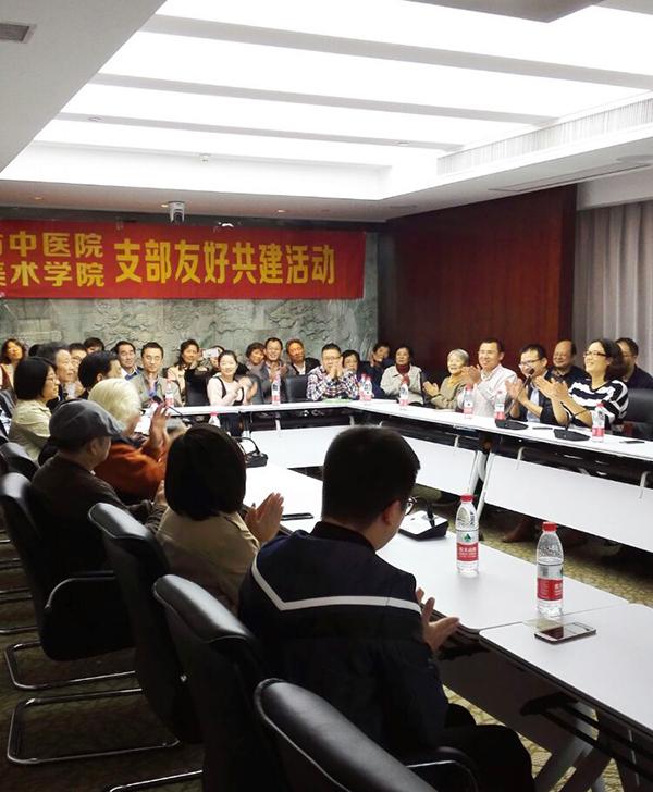 随后,在省中医院会议室正式举行两个支部的共建活动,会议由省中医院支部副主委谢晓红主持,省中医院的丛品主任作“生活与养生”讲座,呼吸科专家王新华作“冬令膏方”养生讲座,健康体检中心杨瑞文主任介绍关于健康管理理念。美院支部向省中医院支部赠送吴山明教授书法“大爱无疆”、卢坤峰教授书法“杜牧诗三首”、张耕源教授书法“康乐和亲皆大欢喜”三件艺术创作。我院吴山明教授讲到学院老一辈教师如诸乐三、陆维钊等是书画家也是中医高手,并畅谈传统文化互通的文化特征。省中医院党委书记、博导曹毅先生也谈到中医到一定的境界必须具备较高的文化修养。