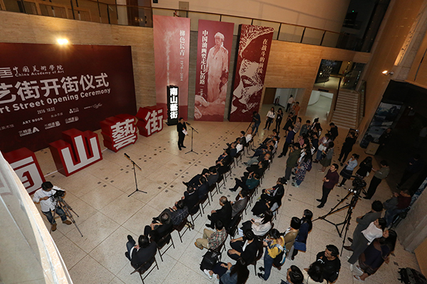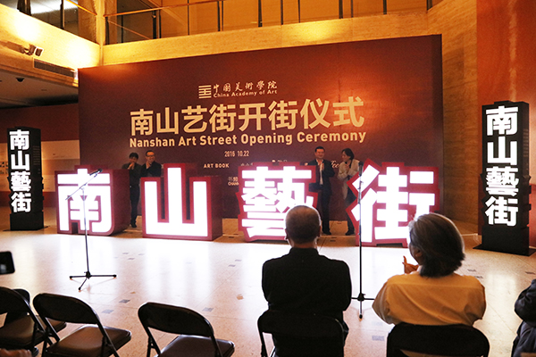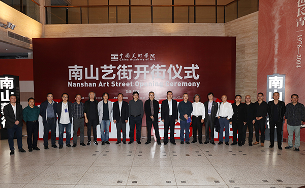 10月22日晚八点半,中国美术学院美术馆灯光璀璨,嘉宾云集,“南山艺街”开街仪式在此进行。中国美术学院党政领导许江、王赞、杭间、刘正、姜玉峰、高世名、徐国强出席开街仪式。上城区委常委、常务副区长金承涛和前来出席“艺术学晋升学科门类5周年学术研讨会”的十余所艺术院校领导和专家共同受邀参加开街仪式。