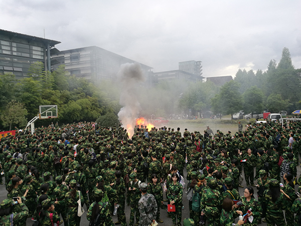 西湖区消防大队王警官对今年入学的全体新生进行了以消防基础知识、消防安全“四个能力”、大学生在校学习期间应注意的消防安全为主要内容的消防专题教育。讲座刚结束,2号楼小剧场周围黄色浓烟弥漫,同学们在浓浓的烟雾中,用毛巾捂住口鼻,在教官、消防安全疏散引导员、现场保安的指挥下从小剧场不同方向快速、有序地撤离火场至安全地带。疏散演练结束后之江消防中队王警官现场讲解并演示了消防器材在灭火救援中的作用和使用方法,并辅导现场的新生进行灭火实践,新生们踊跃加入到灭火实践活动中,亲身感受灭火器材的使用及掌握正确的灭火方法。