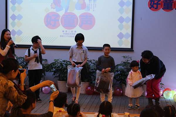 为突出“唱响美好童年,欢度快乐六一”的主题,充分鼓励和培养小朋友参与活动的热情和积极性,使之成为一个美院教职工子女风采展示和亲子互动平台,鼓励孩子展现自我、体验自信,本次活动取消评审设奖,通过抽奖方式向参加歌唱活动的小朋友颁发活动奖品。工会常务副主席陆晓妹,女工委主任、实验教学部主任胡惠君,上一届女工委主任、专业基础教学部党总支书记金琤,工会文体委主任、影视与动画艺术学院党总支书记吕伟军为小朋友们分别抽取并颁发了奖品,书包、乐高拼图、思维训练“逻辑狗”套装、魔幻飞车和彩色铅笔以及橡皮泥套装,每个孩子拿到礼物都无比兴奋和开心。