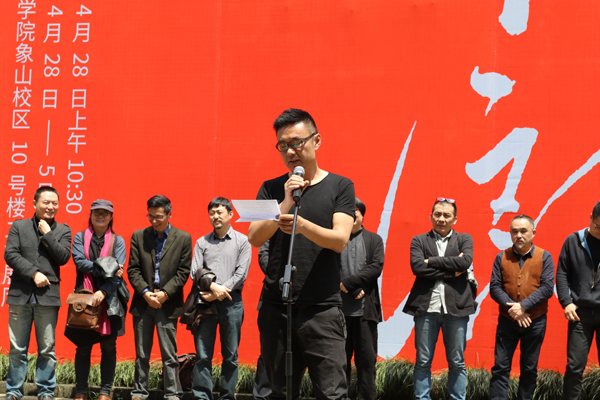 学生代表设计分部孙一杰同学的发言引发了学生对下乡的怀念,为此次展览中收获为艺术奋斗的可喜成绩,而呼唤出“老师,我爱你们”的情感宣言。最后,他与全体同学一起欢呼展览开幕。