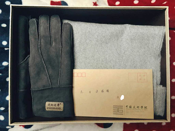 影视与动画艺术学院给同学们准备的,可是精心挑选的围巾和手套哦。脖子和手暖乎乎的,心里更暖啦。