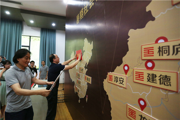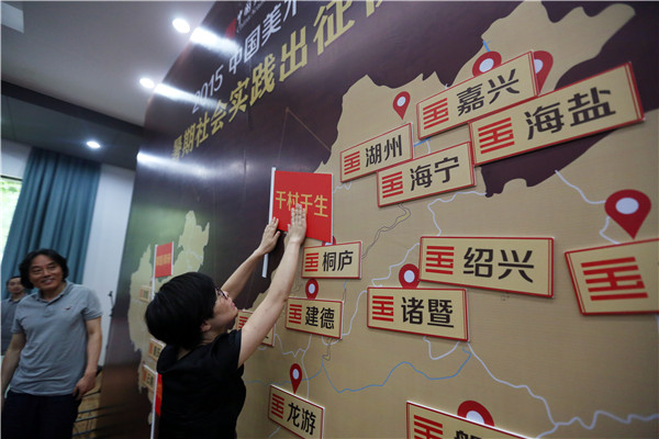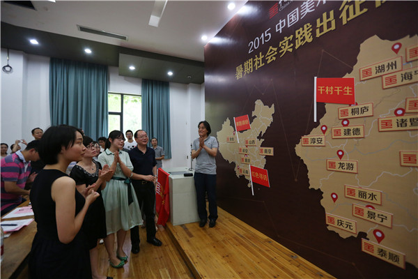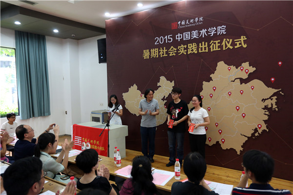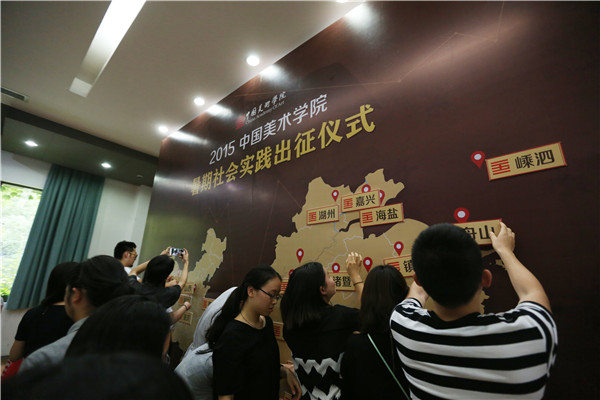 仪式上,各暑期社会实践小分队派出代表,与会领导向“千生千村”小分队发放了中国美术学院师生校友抗战主题作品图片及廉政文化图书,并与各小分队一同将写有各队进行实践活动地点的标志牌贴到特别制作的中国地图和浙江省地图上。