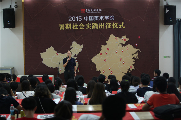 党委副书记胡钟华在出征仪式上讲话,他说自党的十八大以来,习近平总书记提出一系列重要讲话精神,对当代大学生产生着深远影响,团中央提出"四进四信"促使着当代大学生与共青团员从最细微的行动中不断前行,学习贯彻总书记讲话精神,不断践行社会主义核心价值观。在学院的层面,“塑造校园美境、实施校园美育、铸造校园美心",构建三美理想,打造山水相望的精神家园,是我们中国美院的育人主题,也是我们这次社会实践活动的精神内核和动力源泉。因此,这次的社会实践活动主题围绕着“四进四信,三美之行”这八个字所展开。同时,他向全体实践团队提出四点希望:第一,深入群众,主动、虚心地向人民群众学习,摆正位置,植根乡土,在社会的大环境中吸取宝贵营养,同时所进行的社会服务的内容和形式要切合基层实际和需要:第二:脚踏实地,劳作上手,认真了解社情民意,不浮躁,不夸口,真真切切地为当地群众,为基层做一些实实在在的工作,留下一些富有价值的成果;第三,积极创新与开拓,充分利用学知识以及专业特长探索新的实践与研究方法,讲求新实效,制造可喜新变化;第四:加强安全教育与保障,严格遵守社会实践组织纪律,行动听指挥,同时更要注意交通与饮食安全。