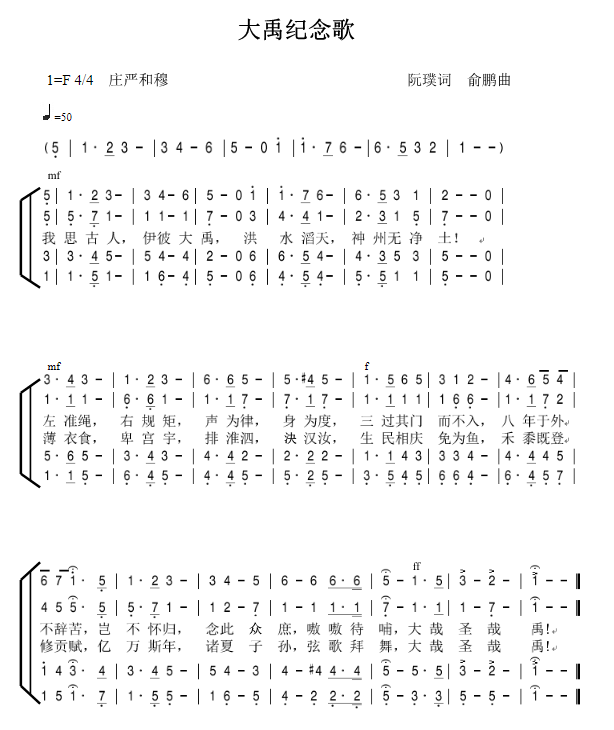 《大禹纪念歌》创作于1947年,全文用文言文创作,讲述了大禹三过家门而不入,胼手胝足八年治水的经历,表现了艰苦奋斗、因势利导、科学治水、以人为本的理念,诠释了公而忘私、民族至上、民为邦本、科学创新等为内涵的大禹治水精神。歌词作者阮璞,是中国著名的美术史论家和诗人,他和作曲的俞鹏,早年都毕业于国立艺专(中国美术学院前身)。