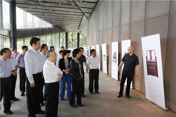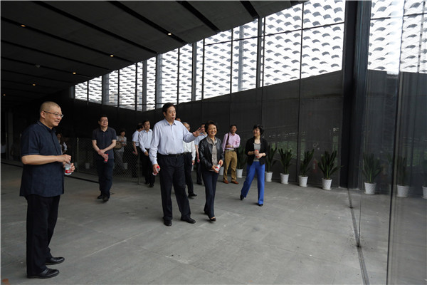 随后,吴志明一行参观了民艺博物馆。许江院长从建馆理念、收藏与展览、教育与传习、建筑与空间等方面作介绍。民艺博物馆以中国传统物质文化、设计思想为收藏、展示和研究对象,致力于中国手工艺文化的承继、活化和再生,在全球化语境中,重建东方设计学体系和文化生产系统,以此滋养当代中国人的生活,传播中国美学价值和文化精神。据悉,开馆展“天工开物——江南乡村工艺的世界”将于2015年9月展出,内容布局共分为四大板块,分别是“百椅百态”、“雕皮为影”,“日用即道”、“格物之知”,将通过“探秘”、“凝视”、“静观”、“抒怀”、“相望”等展示语言来表达。