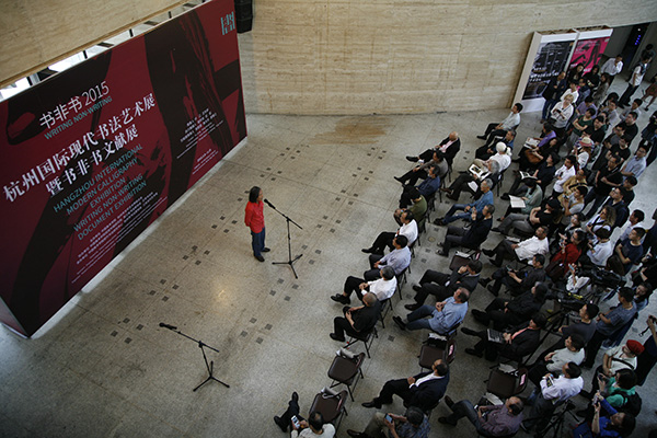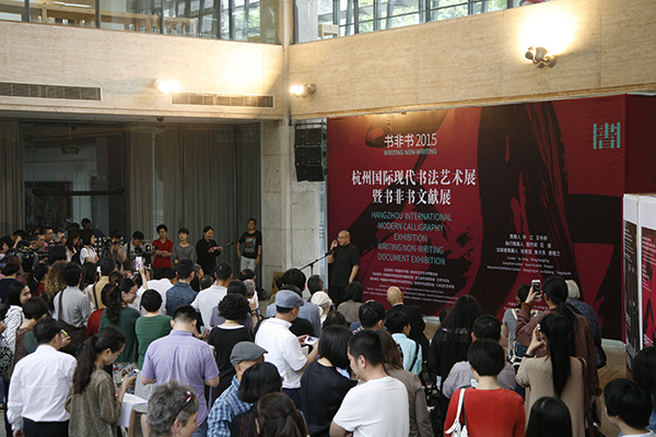 5月8日上午,五年一届的“书非书”国际现代书法艺术节在我院美术馆盛大开幕。浙江省委宣传部副部长胡坚,杭州市委常委、宣传部长翁卫军,我院领导钱晓芳、许江、王赞,原院领导高法根,浙江省文联党组成员、书记处书记高克明,浙报集团副总编陆熙,杭州市文联主席陈一晖、副主席唐奕,国际艺术批评家、策展人、我院教授郑胜天,国际艺术批评家、策展人柯乃柏、劳悟达、史蒙年,著名书法家、我院现代书法研究中心主任王冬龄教授和我院师生等出席开幕式。开幕式由陈一晖主持。翁卫军、许江、王赞、郑胜天、王冬龄先后致辞。