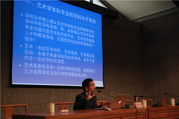 北京大学艺术学院院长王一川作了《艺术学本科专业的学科性及其评价问题》的发言。本次论坛让他想到了艺术与全国艺术院校哲学社会学科的三个关系:一是艺术创作为哲学社会科学提供美的案例、美的作品;二是艺术教育为哲学社会科学培育有生力量;三是艺术学科为哲学社会科学书写多彩华章。他把自己对艺术学本科专业的学科性及其评价分为艺术学本科专业的学科水平现状、艺术学本科专业的艺术性与学术性、与文史哲专业比较中的艺术学本科专业、艺术学本科专业的学科类别、艺术学本科专业的两个教学分支、艺术学本科专业学科性评价指标等六个部分作了阐述。