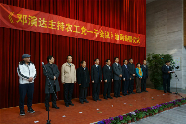 常青老师在仪式上介绍了《邓演达主持农工党一干会议》油画作品的创作过程与感想。他指出,为农工党创始人邓演达创作油画作品是一项光荣而又艰巨的任务,同时也倍感骄傲与自豪。在创作过程中,查阅了大量的文献资料和历史图片,在完成初稿后,根据农工党中央领导的审稿意见,几次修改,终于较为圆满地完成了创作任务。他表示,只要农工党中央有需要,他将用手中的画笔,以更加饱满的热情,去履行一个农工党员应尽的义务。