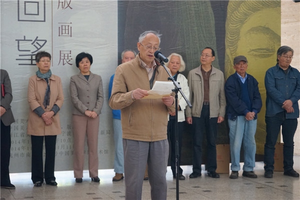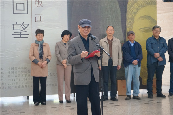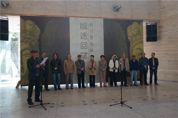 王赞在讲话中回顾了俞启慧教授的创作、教学历程,对他在教学、创作上取得的成绩给予充分肯定。他说:作为新中国培养的第一代版画家,俞先生遵循鲁迅精神,不断汲取中国传统木刻年画和汉代石刻养分,借鉴日本欧洲版画优秀技艺,在人物形象塑造、黑白布局和木刻刀法上,形成了自己的艺术气派。俞教授的版艺创作、教学和研究,坚守半个多世纪。他数十年来坚持文化历史的刻写,作品成果丰硕,主题却极纯朴。或留白守黑,表现文化旗手鲁迅先生;或水印清风,刻画江南乡情。他最大特点在于精于拓印,尤在彩拓语言上颇用专心。彩拓中既凝线描之功,又采影像表现之力。他从事版画教育数十载,著述丰厚,出版了《黑白木刻技法精论》等深含丰富教学经验的技法著作,熏养和引领着代代国美学子。他的每一幅作品都蕴含着深厚的民族传统文化情结,宽广的世界文化感情。这次展览,不仅是他个人创作生涯的一次回顾,也是国美版画向着来路的一次深情回望。王赞对俞启慧教授无偿捐献给学院表达了深厚的谢意。