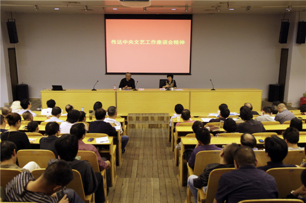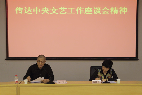 许江院长结合自己参加会议的经历传达了习近平总书记在中央文艺工作座谈会上的讲话精神、讲述了参加会议的深切感受并介绍了自己在座谈会上的发言。他说,中央召开文艺工作座谈会,酝酿已久。习近平总书记亲自主持,听取了七位文艺界代表的发言,并点评和回应大家的发言,认为大家的发言有思想、有见地、有真情。他听取大家的发言后发表了重要讲话,阐述了五个问题:一是实现中华民族伟大复兴需要繁荣文化,阐述了文明与文艺的关系。二是要创作无愧于伟大民族、伟大时代的优秀作品,阐述了时代与文艺的关系。三是坚持以人民为中心的创作导向,阐述了人民与文艺的关系。四是中国精神是社会主义文艺的灵魂,阐述了中国精神与文艺的关系。五是加强和改进党对文艺的领导,阐述了党的领导与文艺的关系。