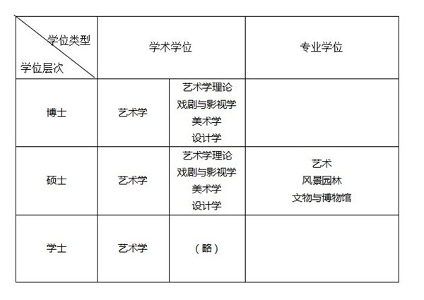 我国学位类别分为学术型学位与专业学位。学术型学位按照学科门类授予,根据2011年新的学科目录中的13个学科门类,分别授予相应学位。我院学术型学位授予的是艺术学学士学位/硕士学位/博士学位。专业学位也分为学士、硕士和博士三级,但主要设置在硕士一级。各级专业学位与对应的现行各级学术学位处于同一层次。专业学位按照专业学位类型授予,专业学位的名称表示为“××(职业领域)硕士(学士、博士)专业学位”。此次硕士专业学位点新增后,我院可以授予的专业学位包括艺术硕士、风景园林硕士、文物与博物馆硕士三种。