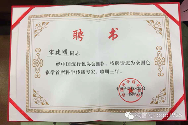6月24日,中国科协在北京召开首席科学传播专家研讨交流班暨第二批首席科学传播专家聘任大会,聘任113名专家为第二批 “全国学科首席科学传播专家”。中国美术学院副院长宋建明教授在色彩学基础理论与系统应用研究取得的令人瞩目的业绩,经中国流行色协会推荐,受聘为全国色彩学首席科学传播专家。