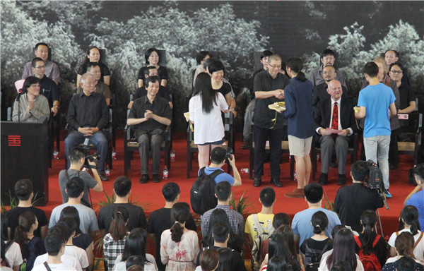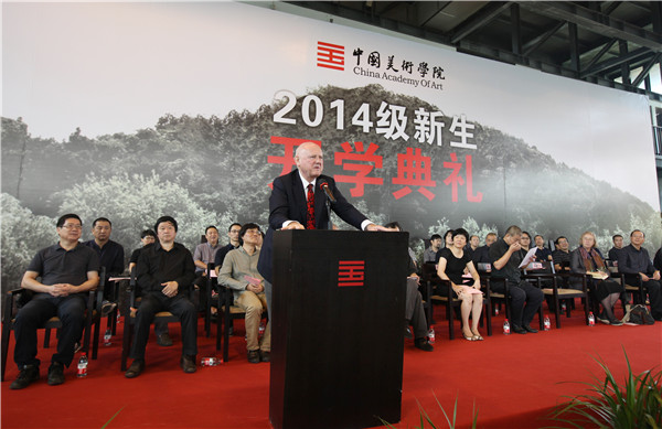 德国海德堡大学教授、德国东方学会会长、巴尔赞奖获得者、西方汉学界最有影响力的中国艺术史专家,同时也是视觉中国研究院院士的雷德侯教授代表名家讲话,他用汉语作了精彩的演讲,讲述了中国美术学院取得的成就及在中国乃至世界艺术教育的中重要地位,并特别强调了书法作为中国独一无二的艺术对个人身心发展的意义和作用。