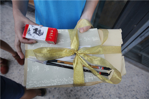 院领导和特邀嘉宾向学生代表赠送笔、墨、纸、帖文化礼品