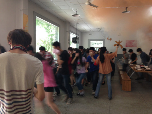5月20日中午12时整,高职学院大门执勤保安头戴钢盔严阵以待地对出入校园的车辆进行仔细地检查,突然其中一辆机动车内蹦出一人,神色慌张,夺路而逃,保安人员见状迅速上前将其制服,交警方初步审讯后该嫌疑人交代为报复社会,已在我院食堂餐厅内放置了爆炸物品,执勤保安立即将一边向“110”报警一边向高职学院领导汇报,高职学院副院长杨安接到报告后当即决定启动《中国美术学院反恐怖事件工作预案》,立刻向疏散、灭火、搜救、救护、警戒等行动小组下达紧急指令。与此同时学院学生餐厅内200名余名学生正在就餐,人声鼎沸,突然餐厅内响起二声爆炸声,不明黄色烟雾四处蔓延,爆炸现场当即有学生倒地,在食堂就餐的学生王XX立即用手机拨打学院报警电话“我是学生,学生餐厅发生不明物体爆炸,可能有人受伤”,正在教工餐厅用餐的老师听到爆炸声后,立即赶到学生餐厅和赶到的疏散组成员一起有序地指导学生向篮球场疏散。搜救组老师配戴防毒面具开展搜救工作,发现一名学生昏倒在餐厅内,即向指挥部报告,救护组成员接到指令后立即驱车进入现场将受伤学生抬到安全地点,医务人员马上对受伤学生实施了应急处理和简单的包扎后送往医院。在疏散、搜救、救护的同时,灭火组保安用灭火器将现场燃烧物扑灭,警戒组保安在爆炸区域和现场周围拉起警戒线,禁止无关人员进入现场,维护校园交通安全。各小组在完成相应的任务后都及时向指挥部报告,篮球场上各系老师立即清点人数并报告指挥部。