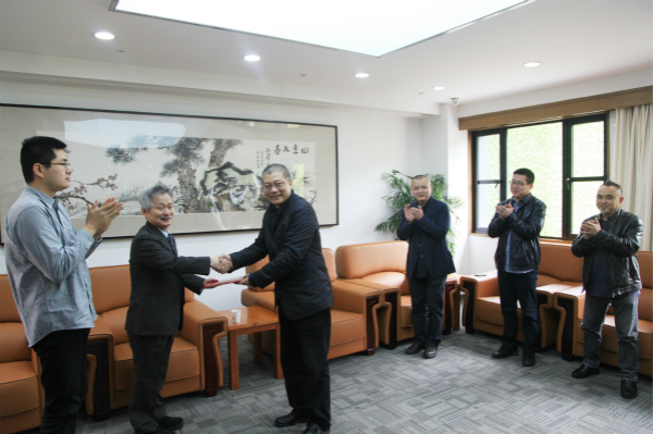 开幕式结束后,我院院长许江与来自日本东京宝冢大学动画部的月冈贞夫教授作了交流。月冈教授此次向中国美术学院捐赠了其个人收藏的大量珍贵动画历史文献,其中包括来自手冢治虫、麦克拉伦等世界动画大师的动画手稿及签名。鉴于月冈教授在日本动画界的重要地位,以及他长久以来致力于中日动画的合作与交流,为增进中国美术学院动画学科力量作出了巨大贡献,许江院长代表学校聘其为中国美术学院客座教授,并亲自为他颁发了聘书。